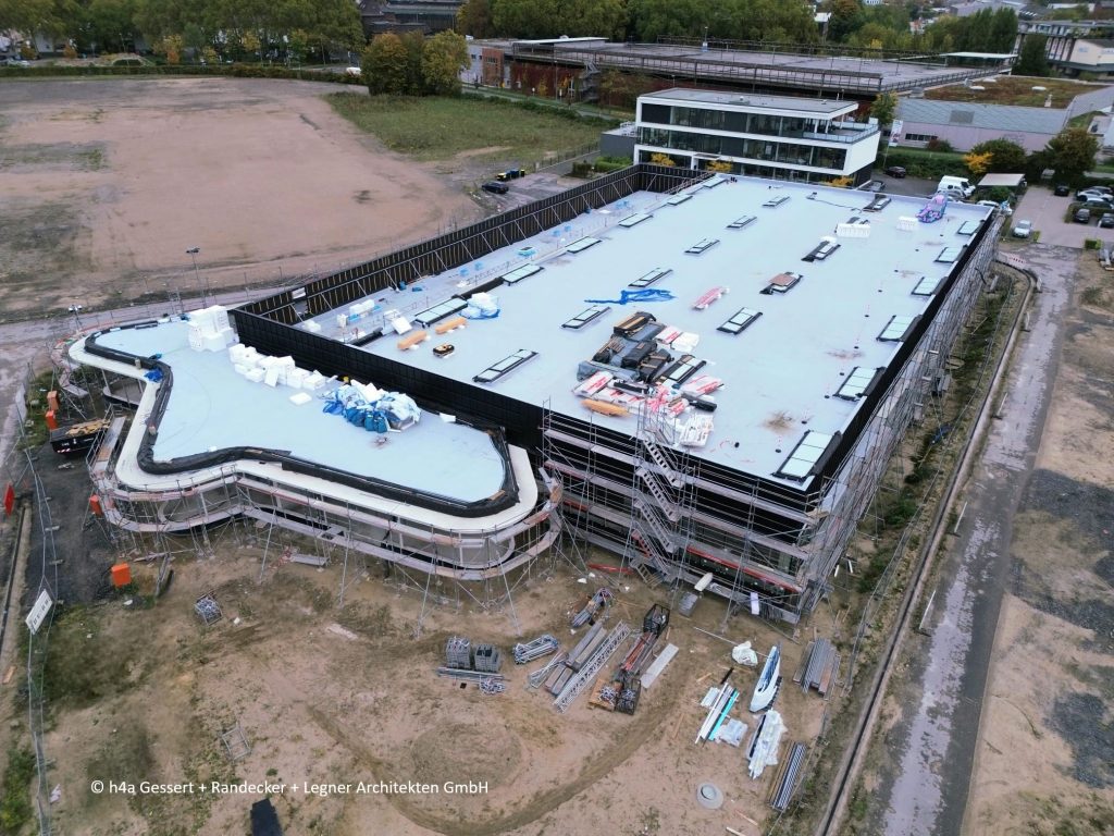 Der Neubau der Sporthalle am Berufskolleg Dinslaken nimmt Formen an. Aus der Vogelperspektive zeigt sich ein besonderer Grundriss: Das Foyer hat die Form eines Schmetterlings und bricht die massive Größe der Vierfach-Halle optisch auf.